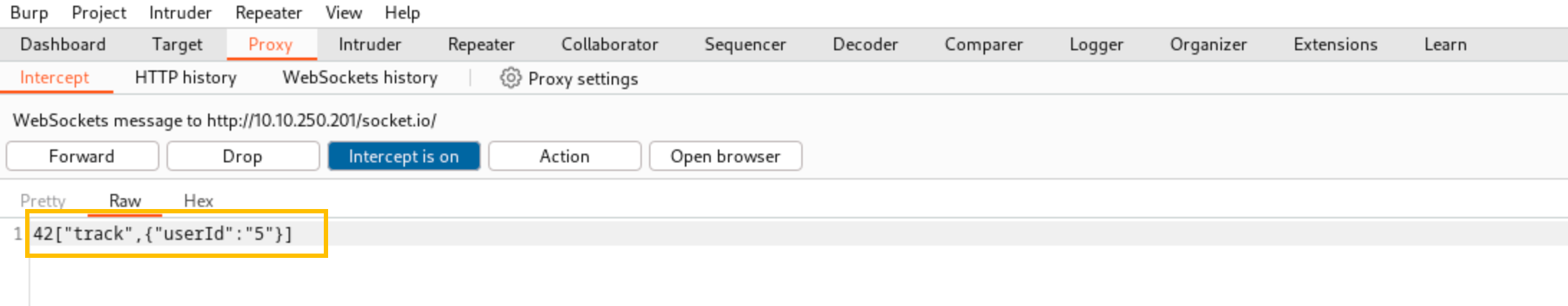 Burp Proxy will intercept the WebSocket traffic, as shown below.