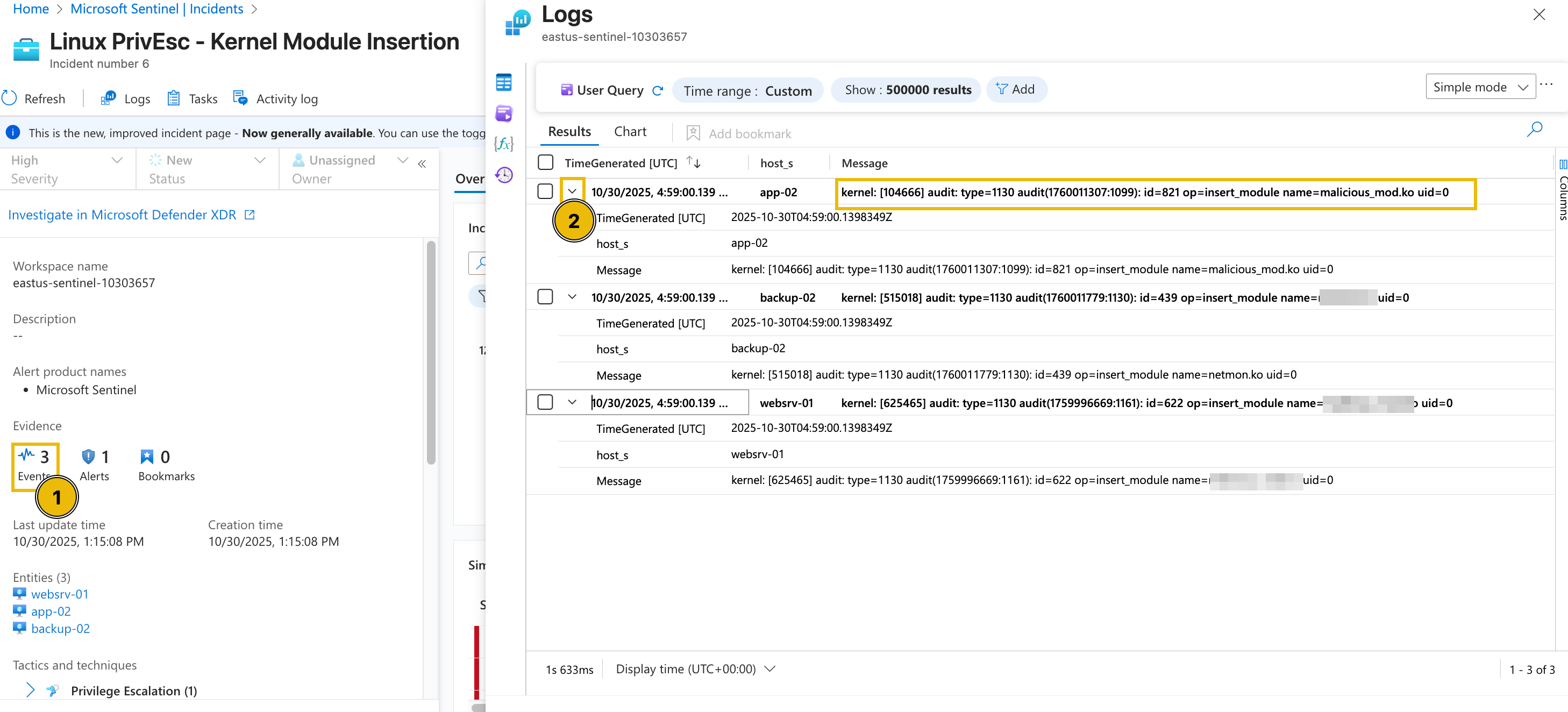 To begin the triage, we’ll examine one high-severity incident in detail: the Linux PrivEsc—Kernel Module Insertion alert. By clicking the alert, additional details appear on the right-hand side.