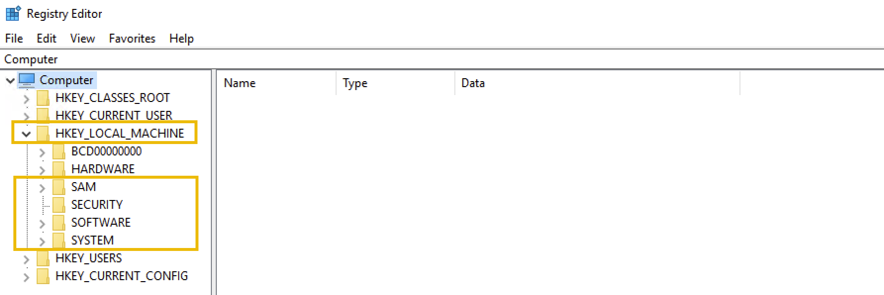 In the table above, you can see that most of the Registry Hives are located under the HKEY_LOCAL_MACHINE (HKLM) key. We can verify this by clicking on the little toggle arrow at the on the left side of the HKLM key in the Registry Editor, as shown in the screenshot below: