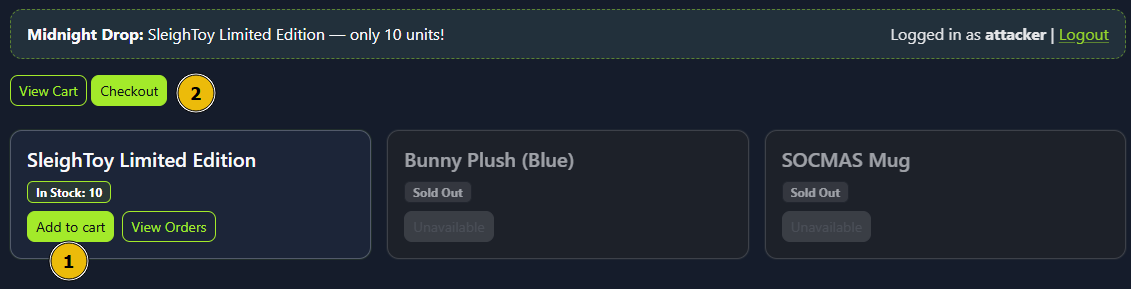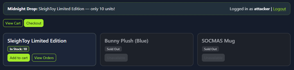 On the site’s login panel, enter the credentials, username: attacker and password: attacker@123. After logging in, you’ll arrive at the main dashboard, which shows the limited-edition SleighToy with only 10 units available.