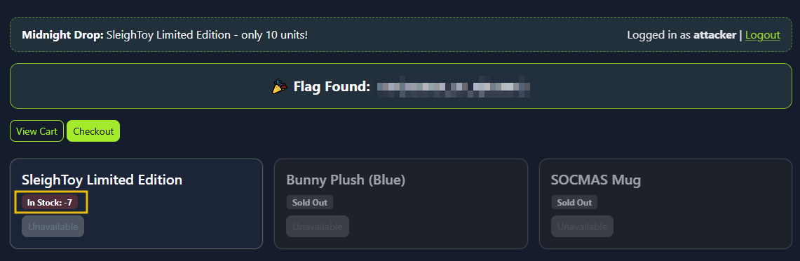 The attacker logged in and made a normal purchase of the limited SleighToy. Using Burp Suite, he captured the checkout request and sent it multiple times in parallel. Because the app didn’t handle simultaneous checkouts correctly, each request succeeded before the stock could update. This allowed the attacker to buy more toys than available, resulting in a race condition and pushing the stock into negative values. Here are a few mitigation measures to avoid the vulnerability:
