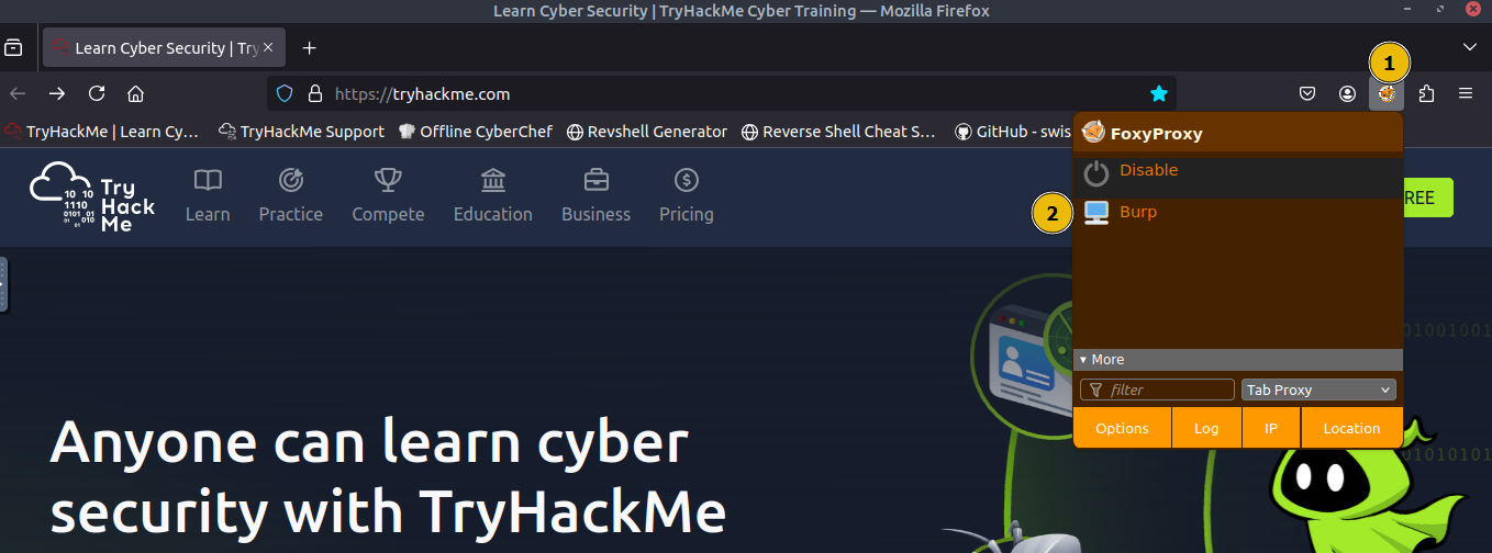 First, we will configure Firefox to route traffic through Burp Suite. On the AttackBox, open Firefox, click the FoxyProxy icon (1) and select the Burp profile (2) so all browser requests are sent to Burp, as shown below: