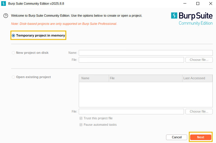 You will see an introductory screen; choose Temporary project in memory and click Next.