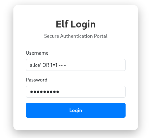 username = "alice' OR 1=1 -- -"