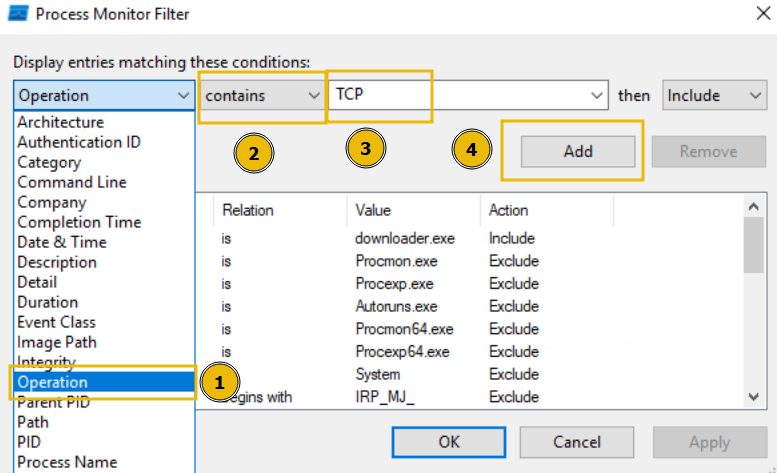 To do so, return to the Filter heading and create the filter we want to apply. For example, we can filter by Operations. Let’s do so below, filtering for any TCP Operation: