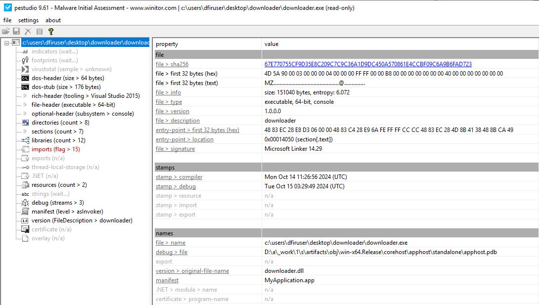This section of the room will demonstrate using PeStudio on an example called downloader.exe. Please note that the information you see will be from this demonstration sample. The sample you will be analysing will be different, but the techniques will still apply.