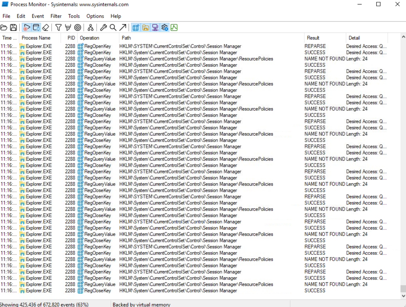 As you can see, there is a lot of information to scroll through here, with the most recent events at the bottom. Here we can see how various system processes are interacting with Windows. Nearly all of it, we don’t care about.