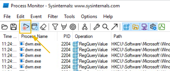After allowing a minute to pass, ensuring the sample has fully executed, we will now stop capturing. To stop capturing more events, click on the Play button in the toolbar of Process Monitor.