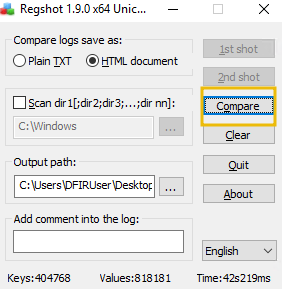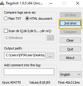 Once we have executed our sample, let’s return to Regshot and capture our second snapshot, using the same procedure as above. Click on the 2nd shot button and press Shot in the dropdown. Regshot is now capturing the registry again, and outputting the differences to a file.