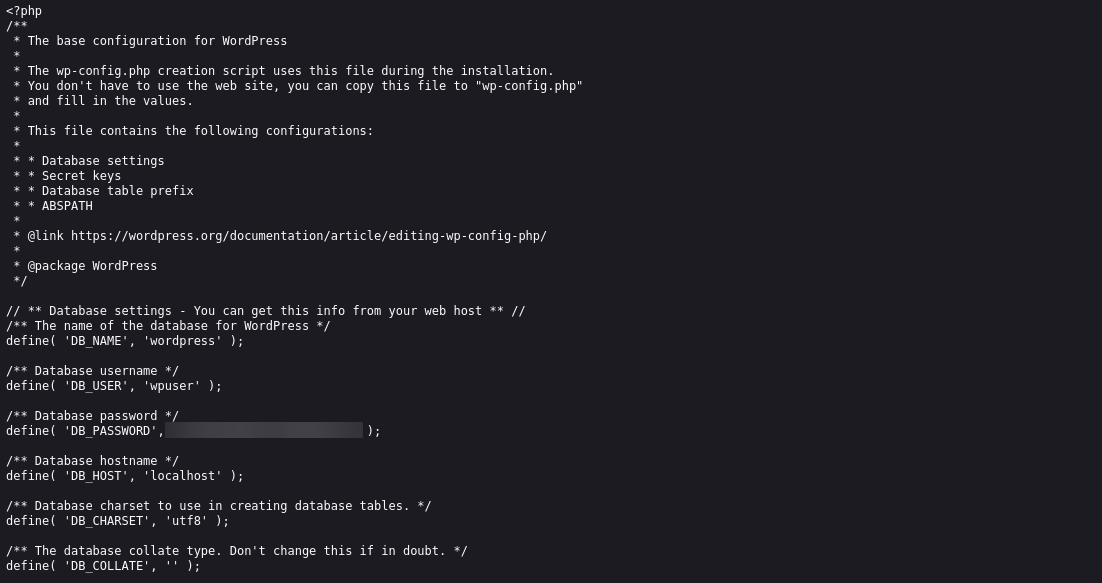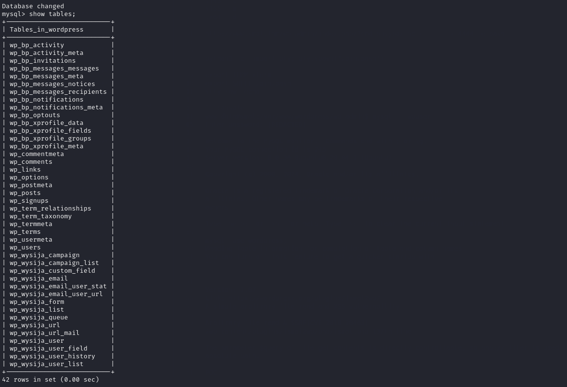The WP creds we grabbed earlier also give us MySQL access. Using mysql -u wpuser -p [REDACTED], we can use it to connect to the database.