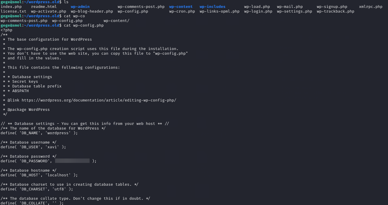 Inside the extracted archive, wp-config.php contains another set of database credentials: xavi:[REDACTED]