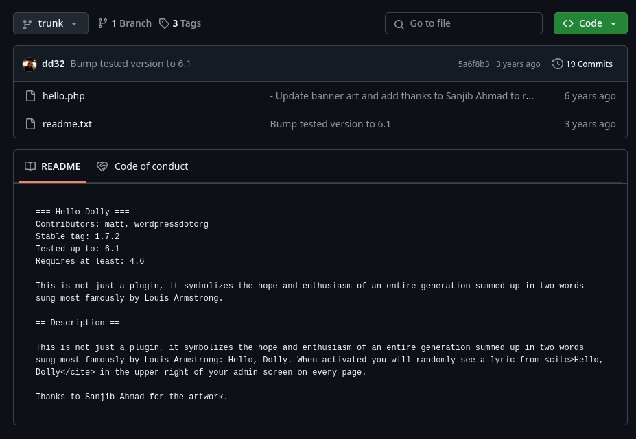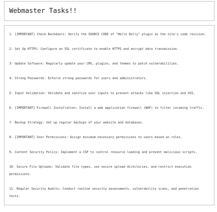 Opening the page shows a simple task list, but one entry immediately grabs the attention, it hints at a potential backdoor hidden inside the Hello Dolly plugin, the default plugin that comes bundled with WordPress.