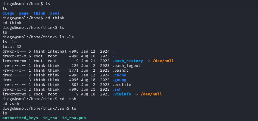 We checked the permissions on the home directory and saw that the group internal has read access. Since our user diego is also a member of this internal group, we inherit that read permission. As a result, we are able to read the SSH key from think.