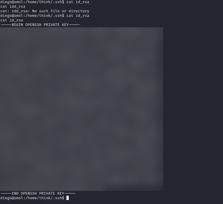 Upon inspecting the home directories of other users, we come across a private SSH key in the think user directory at /home/think/.ssh/id_rsa