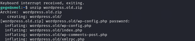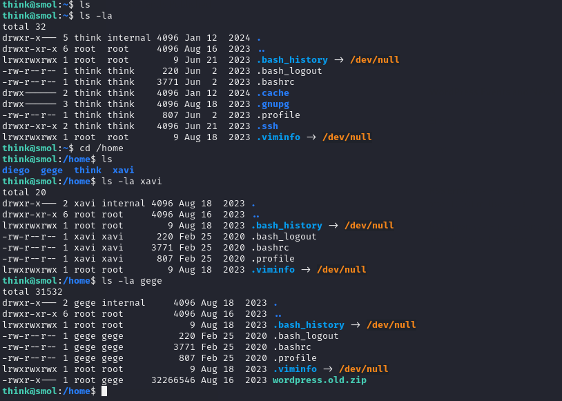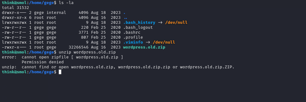 While exploring the home directories, we noticed a zip file in gege folder, likely an old WordPress installation. It could contain useful information but only the user gege has permission to read it.