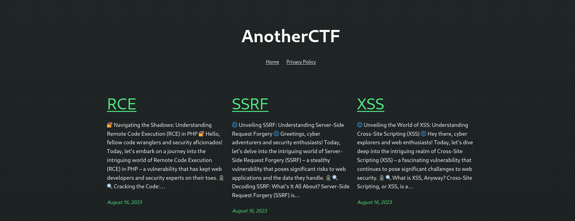 The page appears fairly plain with a few static links, but it actually provides everything needed to eventually achieve RCE. It includes sections on XSS, SSRF, and RCE, which turn out to be important later on.