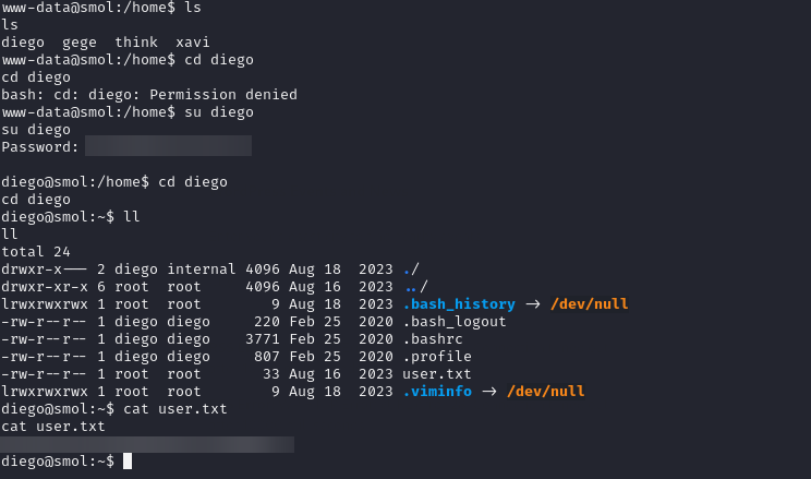 The password isn’t applicable for SSH, but we can leverage it with su to switch to the diego user. Once logged in, we can view the user flag at /home/diego/user.txt